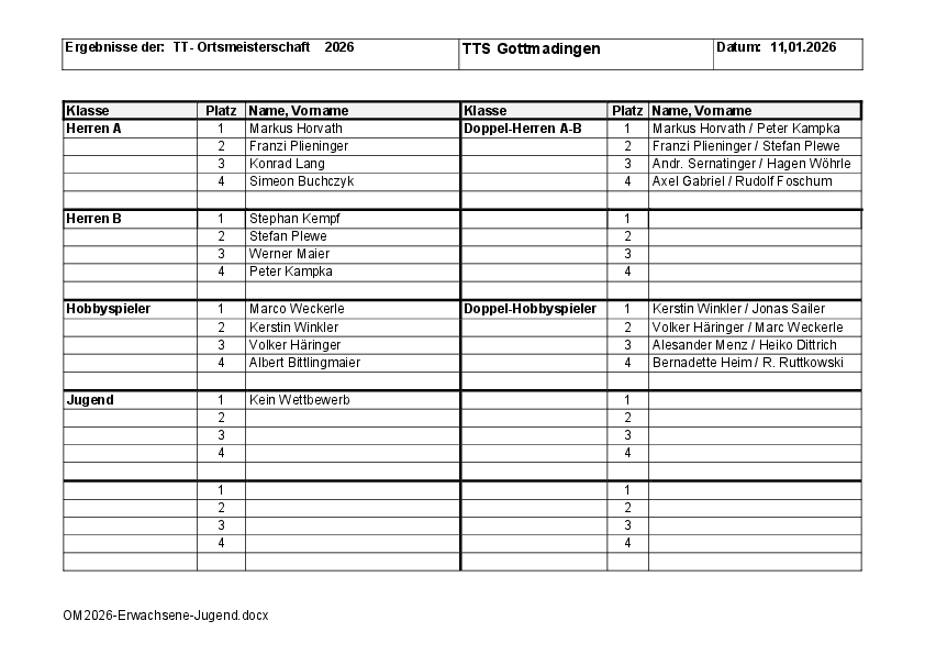 An den Tischtennis Ortsmeisterschaften 2026 in der Hebelhalle in Gottmadingen waren 31 Teilnehmer/innen am Start. Leider konnte keine Jugendklasse wegen zu geringer Teilnehmerzahl ausgespielt werden. Erfreulich gut besetzt war die Hobbyklasse mit 11 Gästen. In der Hobbyklasse setzte sich Marco Weckerle durch, welcher im Endspiel gegen Kerstin Winkler die Oberhand behielt und Ortsmeister 2026 wurde. Dritter wurde Volker Häringer, der das Spiel um Platz drei gegen Albert Bittlingmaier für sich entscheiden konnte. Die Doppelklasse bei den Hobbyspielern gewann Kerstin Winkler / Jonas Sailer vor Volker Häringer / Marco Weckerle und Alexander Menz / Heiko Dittrich. In der Herren A-Klasse wurde in zwei Gruppen gespielt, wobei sich die jeweils ersten beiden der Gruppen für das Halbfinale qualifizierten. In den Halbfinalspielen standen sich Markus Horvath und Simeon Buchczyk gegenüber, wobei Horvath mit 3:1 die Oberhand behielt. Im zweiten Halbfinalspiel musste sich der vorjährige Ortsmeister Konrad Lang mit 3:1 Sätzen gegen Franzi Plieninger geschlagen geben. Im anschließenden Spiel um Platz 3 konnte sich Konrad Lang mit einem knappen 3:2 Sieg gegen Simeon Buchczyk durchsetzen. In einem auf hohem Niveau befindlichen Endspiel besiegte Markus Horvath seine Gegnerin Franzi Plieninger mit 3:0 Sätzen und wurde Ortsmeister 2026. In der Herren B-Klasse wurden ebenfalls zwei Gruppen mit insgesamt 11 Teilnehmern ausgespielt. In den daraus resultierenden Halbfinalspielen standen sich Werner Maier und Stephan Kempf gegenüber wobei Kempf mit 3:0 Sätzen die Oberhand behielt. Im zweiten Halbfinale gewann Stefan Plewe äußerst knapp in 3:2 Sätzen gegen Peter Kampka. Im Spiel um Platz 3 siegte Werner Maier gegen Peter Kampka. Das Endspiel zwischen Stephan Kempf und Stefan Plewe war hart umkämpft, wobei letztendlich Stephan Kempf im fünften Satz sich mit einem 3:2 Sieg die Ortsmeisterschaft 2026 in der Herren B-Klasse sicherte. In der allgemeinen Doppelklasse A-B wurden die Paarungen entsprechend der QTTR-Zahlen ausgelost. Dabei entstanden interessante Paarungen. Gespielt wurde in zwei Gruppen. Im Endspiel gewann das Doppel Markus Horvath / Peter Kampka gegen die Paarung Franzi Plieninger / Stefan Plewe in 3:1 Sätzen und wurde Ortsmeister 2026. Im Spiel um Platz drei setzte sich die Doppelpaarung Andreas Sernatinger / Hagen Wöhrle gegen die Paarung Axel Gabriel / Rudolf Foschum durch.