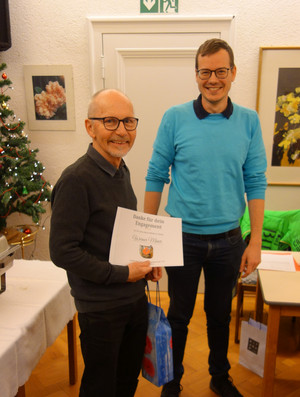Der Vorsitzende des TTS Gottmadingen Axel Gabriel konnte 22 Teilnehmer im geschmückten Saal der AWO in Gottmadingen zur Weihnachtsfeier begrüßen. In einem kurzen Rückblick ging er auf die derzeitige sportliche Situation der Mannschaften in der laufenden Spielsaison ein. Dabei stellte er fest, dass die erste Mannschaft noch Luft nach oben hat, um noch einen der begehrten Plätze 1 bis 4 für die neue Saison zu erreichen. Die zweite und dritte Mannschaft tut sich noch schwer, um sich nach ihrem Aufstieg in der jeweils höheren Klasse zu behaupten. Die vierte und fünfte Mannschaft befindet sich im Mittelfeld ihrer Klasse. Die Jugendmannschaft steht derzeit auf einem guten dritten Tabellenplatz in der Bezirksklasse. Anschließend wurde Werner Maier von Axel Gabriel für seine über 50 jährige Arbeit als Jugendtrainer und seiner weiteren aktiven Mitarbeit im Tischtennisverein in der Vorstandschaft mit einer Urkunde und einem Präsent geehrt. Im Anschluss an die Ehrung wurde es ein tolles Weihnachtsmenü vom Partyservice Peter Kajinowski serviert. Die Abschlussfeier für die Jugend fand bereits am Donnerstag zuvor in der Kegelbahn der AWO Gottmadingen statt.